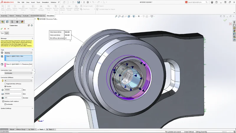 This year we added the introduction of Distributed coupling and Tilt stiffness bearing connectors so you can easily create custom bearing connectors by specifying stiffness in compression, tension, and bending. The bearing connector enhancements are available for Linear static, Frequency, Buckling, and Linear dynamic studies.