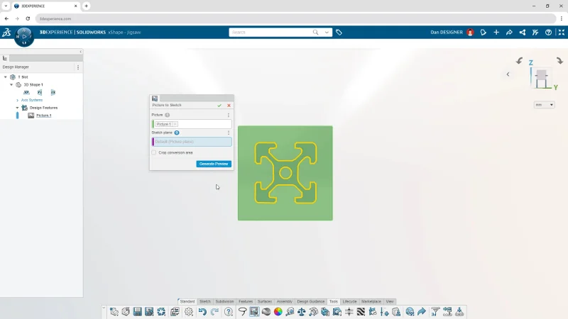 Easily convert images to editable 2D sketches with the “Picture to Sketch” tool. This can be useful for several cases. For instance, if you are working with a logo on an appliance, as pictured below, you can convert the edges of that logo to a sketch. From there you can do an extrude cut so you have a plate with the logo on it on your design. You could also use it if you had a hand-drawn sketch, and you wanted to create features based of that. It’s certainly easier than tracing it with Sketch Entities as you can use the Picture-to-Sketch feature to automatically create a sketch based off your image.