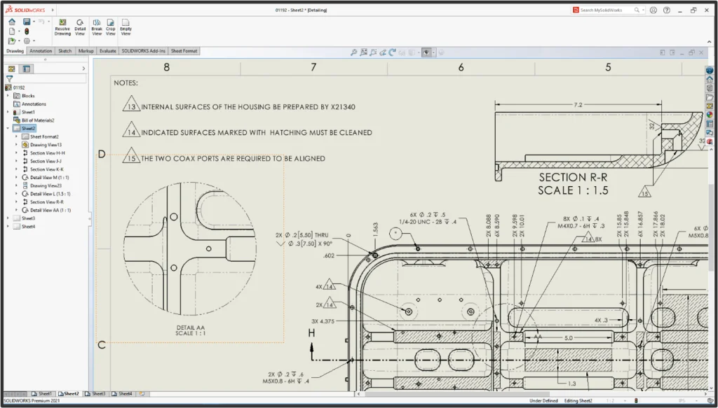 Introduced in SOLIDWORKS 2020, Detailing Mode for Drawings has been enhanced to support for creation of Detail, Break, and Crop views. In addition, hole callouts are now supported in Detailing Mode. Content and characteristics for existing notes can now be modified, and existing dimensions can be fully edited, including tolerance values and arrow type.