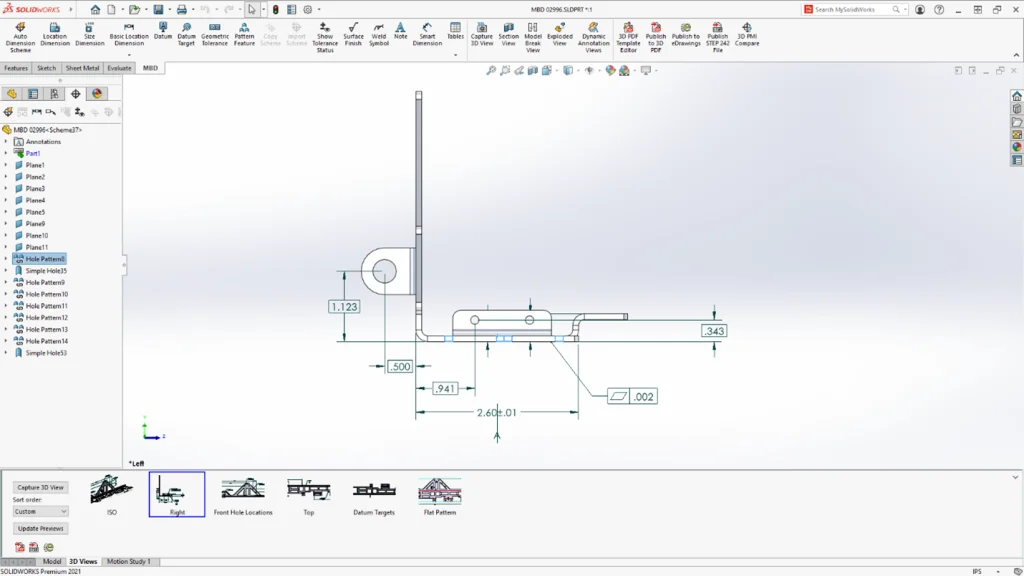 SOLIDWORKS MBD 2021 extends the ability to organize product and manufacturing data (PMI) by adding the ability to add datum target symbols to your DimXpert dimension scheme. You can apply DimXpert location dimensions to datum target points and edit the dimensions to control the location of the datum targets. Also, sheet metal bend tables are now publishable as 3D PDFs, which have improved display quality.