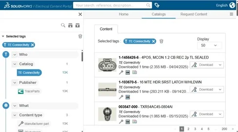 These new catalogs will follow the same high-quality standards established with TE Connectivity, providing complete electrical data, schematic symbols, 2D footprints, and 3D models for use in SOLIDWORKS Electrical and CATIA Electrical. They are planned for integration progressively throughout 2026, expanding the library available to designers worldwide.