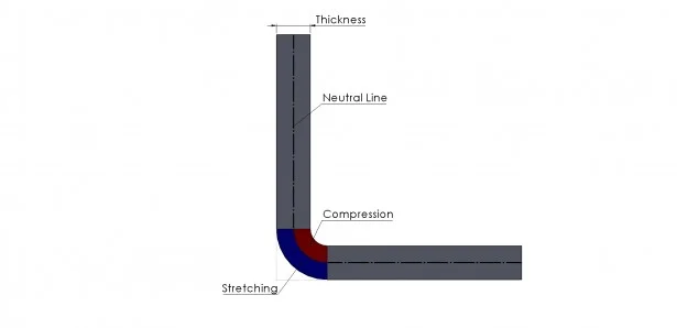 KFactor – This method calculates the flat pattern based on the neutral line of the material. When we have a fold in a sheet metal part there is compression and stretching of the material. The neutral line lies between the transition of stretching and compressing of material as shown in the below image.