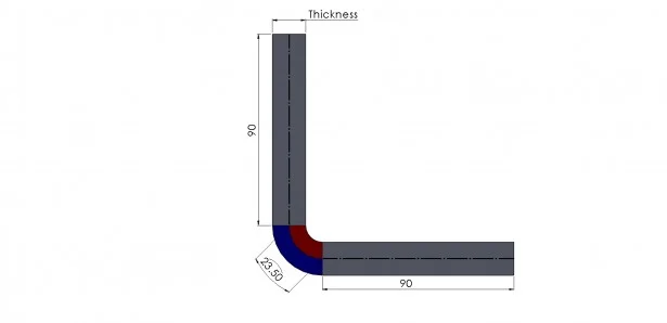 To get a more accurate result, our bend deduction value should change (increase in the above example) based on the angle we are bending to. This is the reason bend tables are used. They allow us to define to automatically select bend deduction value based on the angle we are bending to and the thickness of the sheet. (Kfactor& Bend allowance tables are also available).