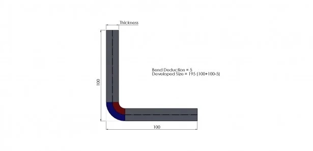 Bend deduction allows the user to calculate the size of the developed sheet by subtracting a value from the external dimensions of the sheet. In the below example we will specify a bend deduction of 5mm – so our developed sheet size would be 195 (100+100-5)