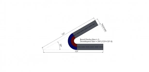 The most common issue we come across is where people use bend deduction, and do not adjust the bend deduction value for non 90 degree bends. This is especially true where we have acute angles. In the below example we have a 30 degree bend. The outer dimensions for this sheet are taken from the virtual sharp – which as you can see sit a fair distance away from the model and give us a large outside setback region. Therefore our developed sheet size is 269mm (137+137+5), which is actually much bigger than it should be.