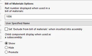 Go to the Bill of Materials Options section, then select User Specified Name from the drop-down.