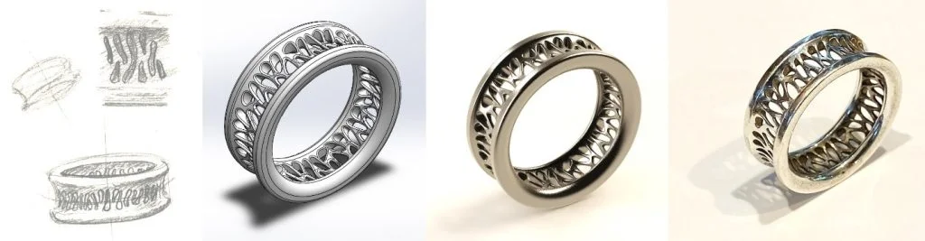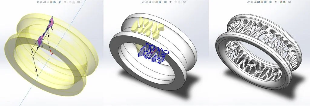 I wanted the ring to look simple but dynamic, and the concept I envisioned was two rings melting apart, with strands of “melting” metal holding the two rings together as one. I started with some simple sketches of the idea, and quickly moved to modeling in SOLIDWORKS. I utilized one revolve feature to start, followed by patterns of extrude-cuts of shapes that I created using spline tools. I finished off the model by adding fillets to soften any sharp edges, and then I used SOLIDWORKS PhotoView 360 to create renderings of the ring.