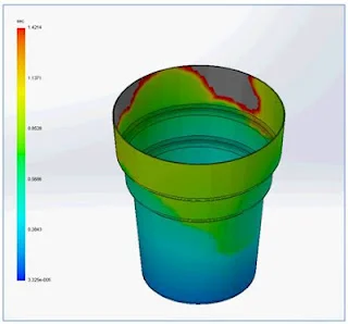 Using SolidWorks Plastics Professional to run a simulation study, it can be seen that the original wall thickness of the cup was too thin which caused a “short-shot” and the cup would not have been moulded fully. This is where the plastic material reaches a solidified state through cooling before it can completely fill the mold and is often evident where thin sections of the design cause the plastic to cool too quickly.