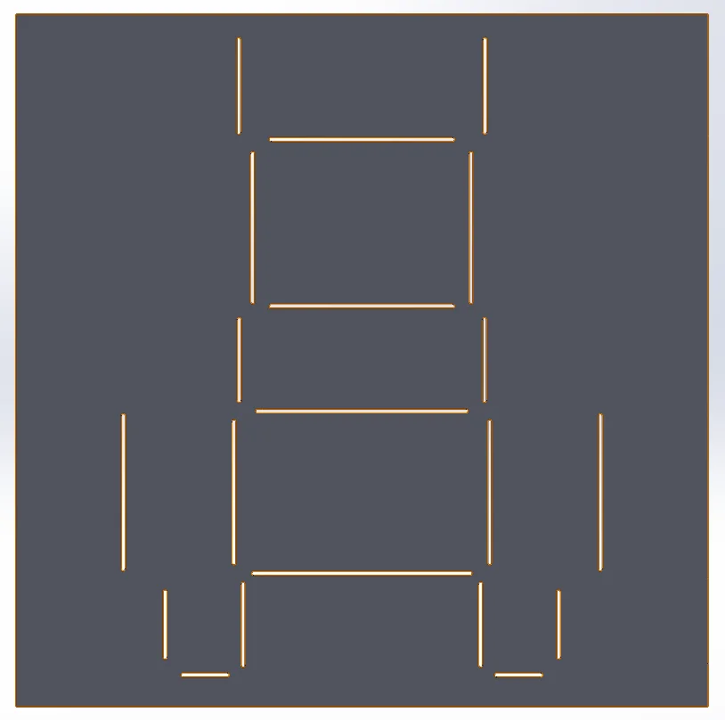 One helpful feature of the SOLIDWORKS Sheet Metal Flatten Tool is that it produces a sketch called Bend-Lines. The Bend-Lines sketch contains construction lines on top of the flattened model which represent the center of the bends in the folded model. This sketch was used to create another SOLIDWORKS Part file which contained the bending template. The slot sketch tool was used to place slots on top of the bending lines and then was extruded to the thickness of ¼” acrylic. Slots were also added to position the cardboard under the bending template.