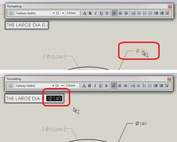 Let’s examine the process of combining dimensions into notes using the SOLIDWORKS Note feature: