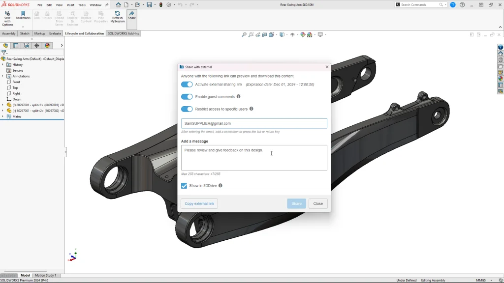 Share and Markup allows you to create a shareable version of your 3D design files directly from your working file in SOLIDWORKS. This is a game-changer. Through the connection to the 3DEXPERIENCE platform, you can manage who has access to that file by generating a sharable link you can then send to whomever you would like to grant access to your design. With this functionality, Share and Markup eliminates the friction traditionally associated with file sharing. In addition to being able to create a shareable link, you can also share the file directly through the 3DDrive, the 3DEXPERIENCE platform’s file sharing app. Both options offer a seamless, fully browser-based sharing experience—the recipient has nothing to download, nothing to install, with no license required.