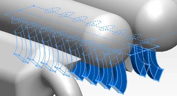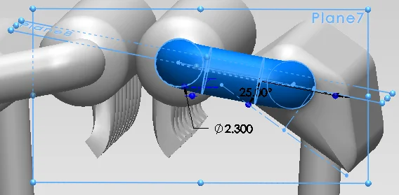 To connect the distribution tubes to the cylinder heads I used lofts. For the ease of construction I connected each square section of the cylinder head’s holes to a circular profile. The real engine has only circular tubing / piping, but I built this part only to prove the concept of exhaust -> turbo -> intake, while keeping a relative similar look. By knowing the spacing between the rectangular holes in the cylinder head sides, I created a plane that goes through the two targeted tubes and sketched two linear patterns of equally spaced circles.