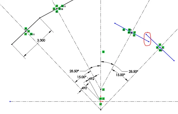 I started building this intermediate block by initiating a sketch on the front plane and drawing a horizontal and a vertical centerline through the origin. Then, I drew four more centerlines, and set them to the angles described above (also see the below picture). Then I merged their bottom endpoints. The next step was to create the crank offset: I set the distance between them and the origin to .492 inches. To begin drawing the outline for the top surfaces of the engine I drew four lines, each perpendicular to and intersecting one of the 1-4 axes in its midpoint (see the below picture). I also merged the ends of the two pairs of adjacent lines.