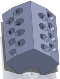 For making the mating of the pistons easier, I created axes through each cylinder. The order I used is the number order seen below. The first piston that connects to the crankshaft is number one, the second number two, and so on, like in the image below.