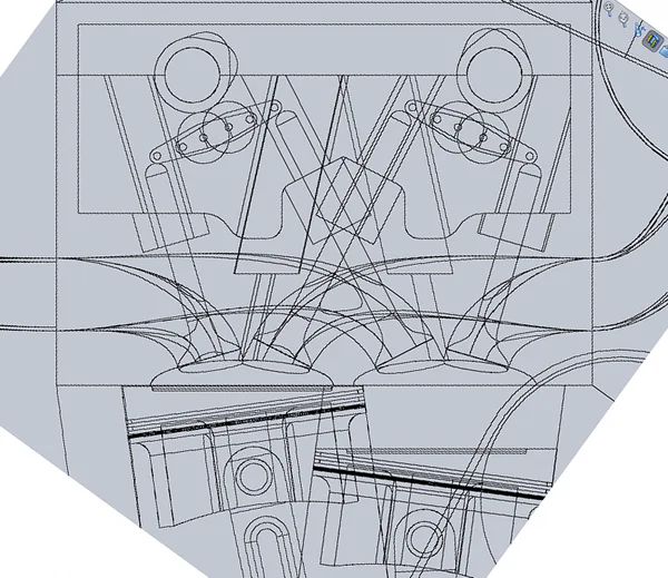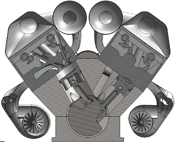 Before starting the build we need to understand this particular type of engine and its cylinder head. Because the cylinders are so tightly packed, two camshafts are enough for two rows of cylinders. The following is a section view of the cylinder heads on the block: