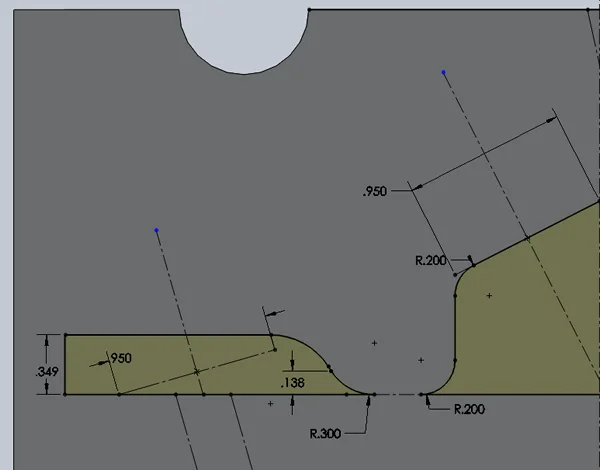 I already knew the width of the springs (.95’’) and the position of the valves (seen on the sketch in construction lines, as converted entities). The left side shows approximately how I cut into this profile after I extruded. The curves used are purely guessed cosmetics in this case and do not interfere with the functional aspect of the part.