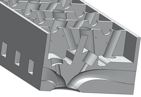 In the previous post I presented the part with the combustion chambers and the valve head holes. Now I will continue with the channels that link the intake and exhaust manifolds with the combustion chambers (see the above picture).