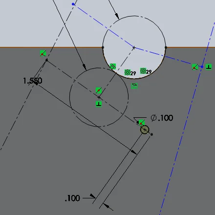 As you can see, the roller is tangent to the camshaft axle and can “swing” in search of a position. The next image shows the finger locked into place and the .100’’ circle that is ready to be used in an extruded cut lengthwise along the cylinder head part. The angle between the finger and the valve (or the lines that represent them) is almost 90 degrees, so that when the finger is going to be hit by the exccentricity of the cam and pushed down, the angle will reach 90 and slightly over, but not reach extreme values (because of the fixed length of the finger, if it rotates too much it does not touch the head of the valve anymore).