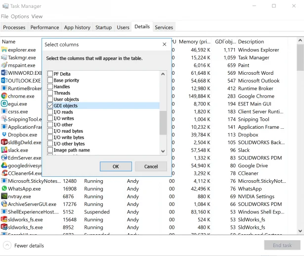 SOLIDWORKS should not require more than the default limit of 10,000. If you observe over 10,000 GDI objects after following the below steps to monitor GDI usage, contact your local Value Added Reseller (VAR) for assistance troubleshooting this and reporting to SOLIDWORKS Support.
