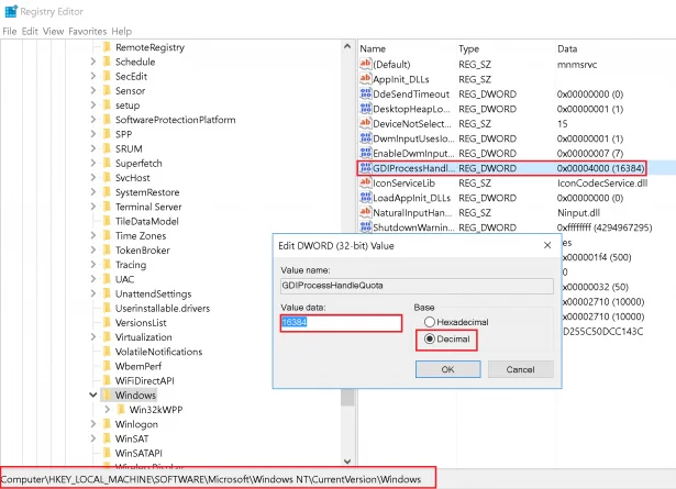- Locate to the key: HKEY_LOCAL_MACHINESOFTWAREMicrosoftWindows NTCurrentVersionWindowsGDIProcessHandleQuota
