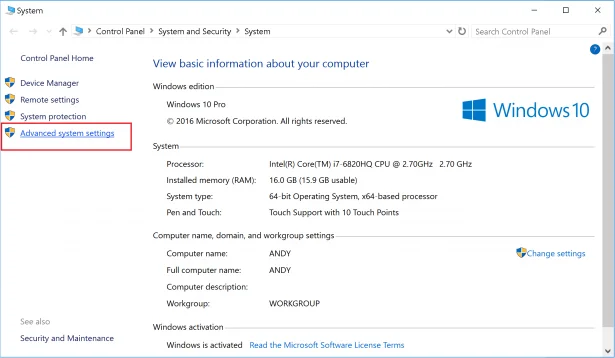 - System > Advanced System Settings > Advanced (Tab) > Settings..