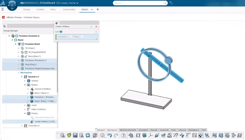 Understand critical system conditions during simulations by defining the center of mass probes for a single body or a combination of bodies with the Center of Mass command.