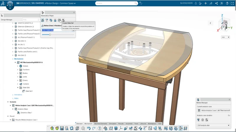 You now can store and apply the state of a mechanism from the Kinematics Player. From the Kinematics Player, there is a new option to create a state-set element that records the position of bodies in a mechanism. The state sets will appear in the DesignManager Feature Tree, and you can apply them to your models anytime you need them.