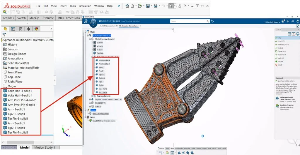 You can now streamline the design/simulation process using the SOLIDWORKS multi-bodies of a part. This commonly used design technique simulates the interaction of assembly components.