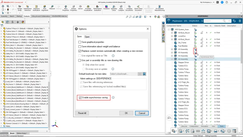 We’ve talked about asynchronous save before and now it’s even faster as you have the option to select “Enable asynchronous saving” under Tools in the My Session Task Pane. Once you enable this feature you can continue to work on your CAD model as the save carries on in the background. MySession keeps you updated in real-time on the saving status of your components so you can see whether they are in progress and have been saved so you can continue to design.