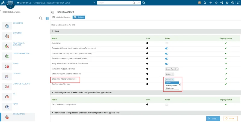 There’s a new option to completely block a save if a title is not unique when someone goes to save a file on the 3DEXPERIENCE platform. Admin can enable that setting and has the option to set “Warning at save” so users get a warning or can also select the “Ignore” setting. Note, if the “Block save” option has been enabled and a duplicate is found the Save option will be greyed out.