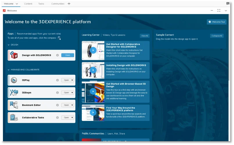 The Welcome App provides fast access to helpful resources for both new users and novice users to help you come up to speed and access all your roles and apps from one convenient location. The Welcome app features short video tutorials, tips, and lessons so you can get started quickly in Collaborative Designer for SOLIDWORKS and get to know your way around the 3DEXPERIENCE platform. In addition you can easily access SOLIDWORKS communities, the EDU Space learning platform, which features more in-depth tutorial; and even launch your other roles and apps right from the Welcome App.