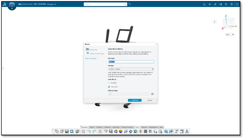 Simplify your workflow with access to all sharing options in one place, such as Share File, Share in Community and more! Now you can access all from one command in the action bar and share directly from 3DDrive. You can also share externally from this new share menu as well.
