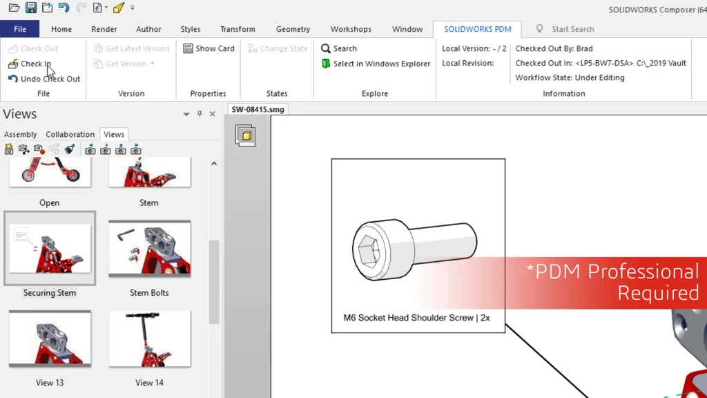 SOLIDWORKS Composer 2019 for the first time will offer a basic integration with SOLIDWORKS PDM for our SOLIDWORKS PDM Professional users. This new feature will make it extremely easy for you to be able to do basic PDM tasks like check in, check out, get latest revision, etc., directly from SOLIDWORKS Composer via the Ribbon bar menu. We will be looking to enhance and improve this integration over time and are actively taking feedback on what they would like to see in this integration next.