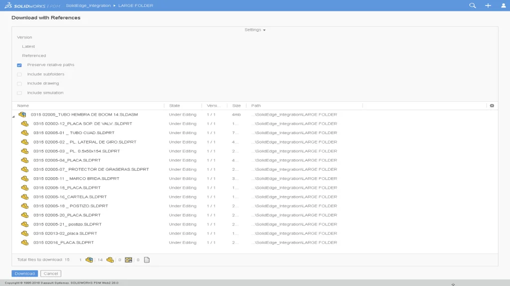 SOLIDWORKS PDM Web2 has a new Download with References dialogue box that provides detailed options to help ensure you’re downloading exactly the files you want. The file list includes options based on these settings: