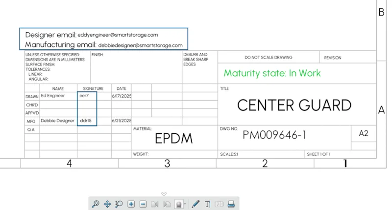 Now we’ve further extended the attributes to include user names or email addresses. You can stamp the user names or email addresses of the users who participated in the drawing release process. This information will also display in 3DPlay and other Dassault Systèmes web viewers.