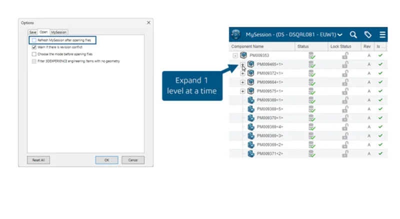 Experience better performance when opening large models with complex assembly structures. As you already know, when you open an assembly, the entire tree structure in MySession is completely expanded and updates on each file are fetched from the 3DEXPERIENCE platform. Now when you disable “Refresh MySession after opening files” in Options from the Tools tab of the MySession Action bar, opening the file will load only the first level of child components. Subsequent expansion only opens one level at a time, helping reduce load times and improving file structure browsing.