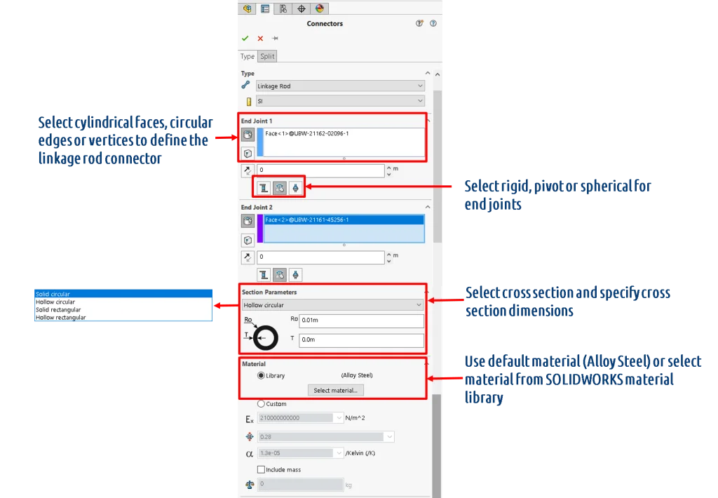 The new Linkage Rod connector enables you to simulate a rigid or flexible behavior between components in an easy yet powerful way. To define this connector, you can choose among cylindrical faces, circular edges, and vertices. The end joints can be set to give a rigid, pivot, or spherical connection. The link connector Cross Sections can be selected and given dimensions, including Solid Circular, Hollow Circular, Solid Rectangular or Hollow Rectangular. The default material for this connector is Alloy Steel but you can select any material from the SOLIDWORKS material library.