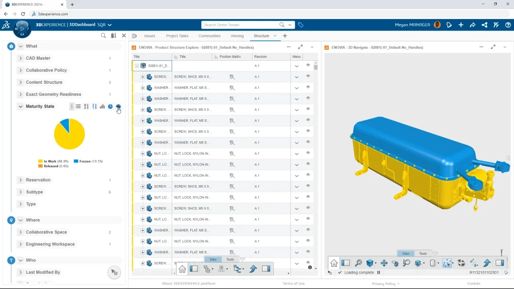 3DEXPERIENCE Works offers a single product definition, allowing anyone in a company, based on their function and access rights, to view, modify, and contribute to one continuous workflow and one single source of truth in real time. Connecting all the relevant people with complete visibility of the changes and progress, deliverables, processes, and tools advances product development.