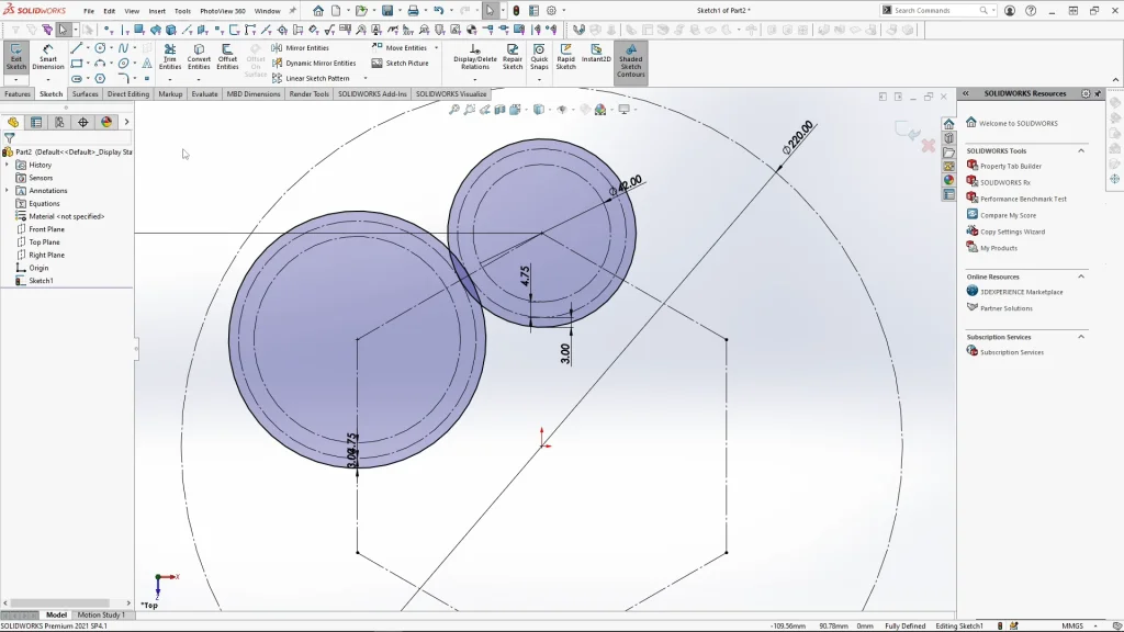 I began with a new part and sketched a guide circle which represents the overall size of my toy base part, and also a hexagon to help place the cogs into the right place at the same distances apart. I could then use the points of the hexagon to create the guides for my two cogs. There is an inner circle for the inner diameter of the cog, this is where the teeth would end. A middle circle for the cross/intersection point of the cog teeth and then the outer circle for the overall cog size. The ratio difference between my cogs is 1:1.36, this can change but the teeth ratio may not match up unless it is also 1:1.3 teeth.