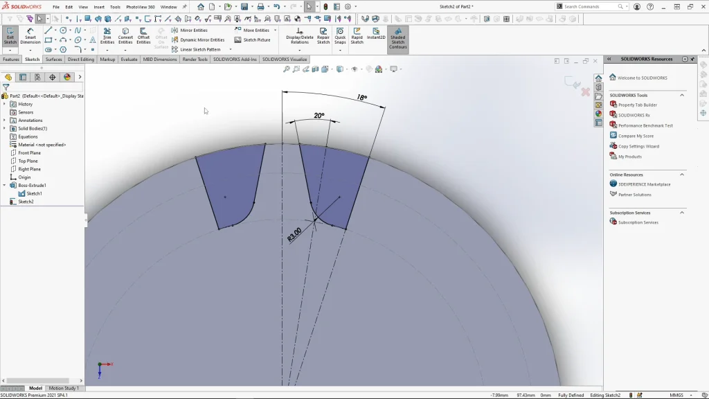 When creating the tooth sketch, I start by creating half of the tooth between 3 centerlines, The angle between the outer centerline guides of the tooth is calculated by dividing 360 degrees by the number of teeth of that cog, which is 10 for the smaller cog, this is then divided by 2 this will form half of the tooth. This gives me an angle of 18 degrees. The tooth sketch itself has a gear pressure angle of 20 degrees, any gear working with this gear would have to have the same pressure angle. The tooth sketch is then mirrored over and cut through the cog. I softened the overall tooth with fillets before it was patterned.
