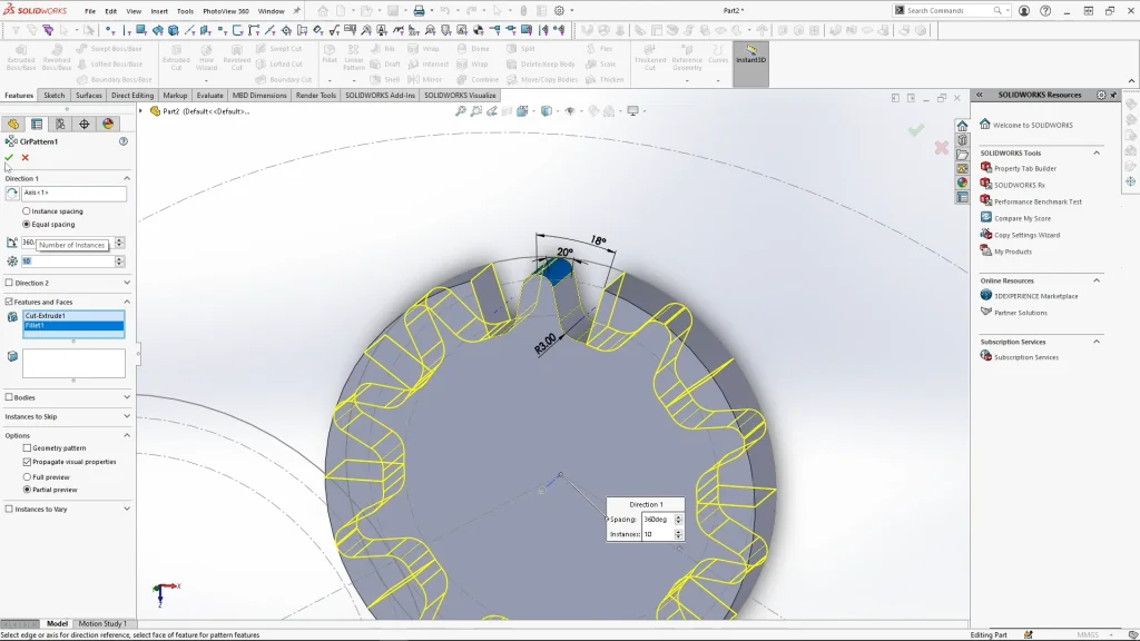 There are two different sized cogs needed for this toy, one has 10 teeth and the other has 13, I have already pre-calculated the size I need each cog to be for the overall size of my toy. In this tutorial I will demonstrate the use of circular pattern, save bodies and motion study with motors. All the cogs for the design were modeled within one part file, I could have created one copy of each sized cog, but by modeling all of them in the one part file I could test the overall placement of the cogs, but more importantly for this design, I have a different appearance and decal applied to each cog, so individual parts are needed for each cog biscuit type. If I were to only add a different appearance to each cog, configurations with linked display states could be used instead.