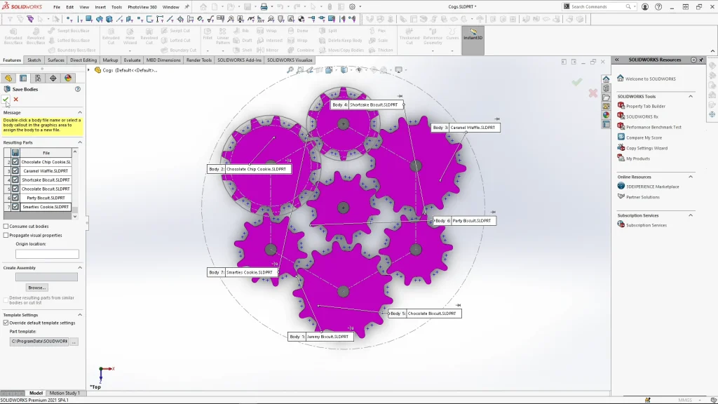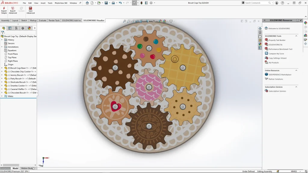 All of the cog solid bodies were all renamed to the corresponding biscuit design, that way when I opened them up as individual part files, I could apply appearances and my custom biscuit decals. I have added the finished cogs to the download file, I don’t demonstrate adding the decals or appearances in the tutorial, but you can play around with the deals from the file if you wish to, or you can use my cogs for the final assembly. In the assembly I do show you how to add a handle extrusion to the waffle style biscuit, this would be used for the play aspect of the toy, but it is also the cog I add the motor to in the motion study further on into the tutorial.