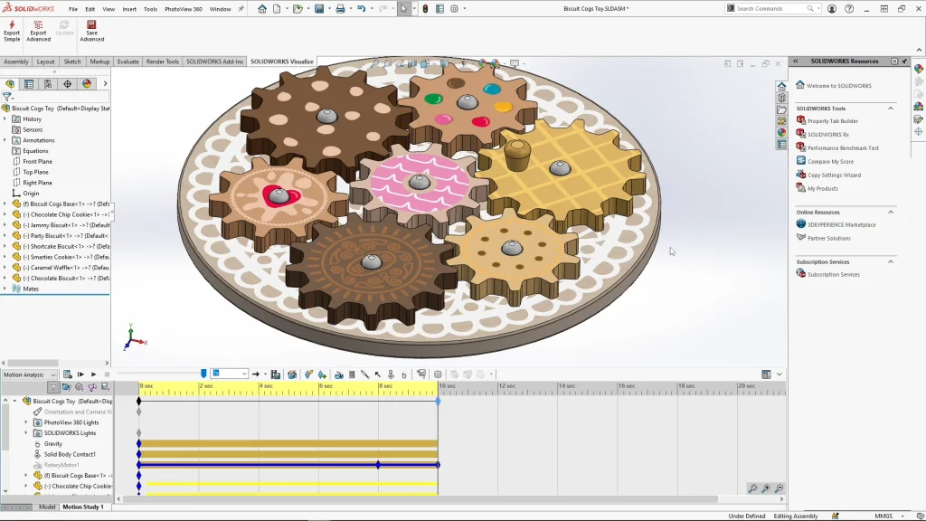 Finally, the fun part is the motion study, I changed the study type to motion analysis, and applied gravity along the y axis, I always add gravity even if I think my mates over define it. Next, I add contacts, selecting all components as they will all be interacting with each other. Then I applied a motor to the top face of the waffle cog moving clockwise. For the speed of the motor, 6rpm is plenty. Dragging the black diamond time key of the study to 10 seconds, and the time bar to 8 seconds, I could edit the motor at 8 seconds to lower the speed of the cog to 4rpm and apply it. Then dragging the time bar to 10 seconds, I could reselect and edit the motor again and turn it off to stop the motor completely at this point. Once I have calculated my analysis, I can export out my animation with the visualize tab and the export advanced options which allows me to send out the study information. Within SOLIDWORKS visualize I can create rendered animations, you can see the final animation I created at the end of the tutorial.