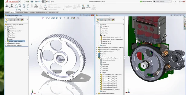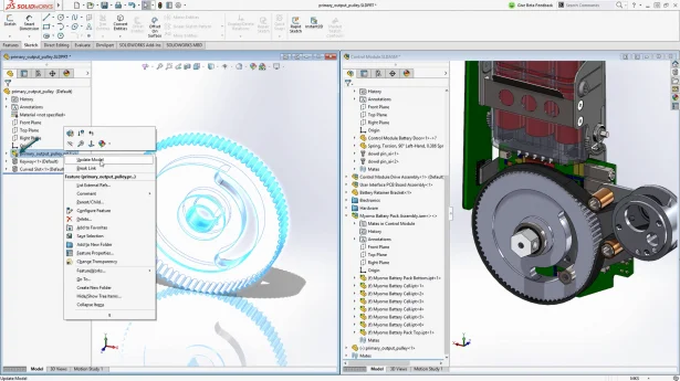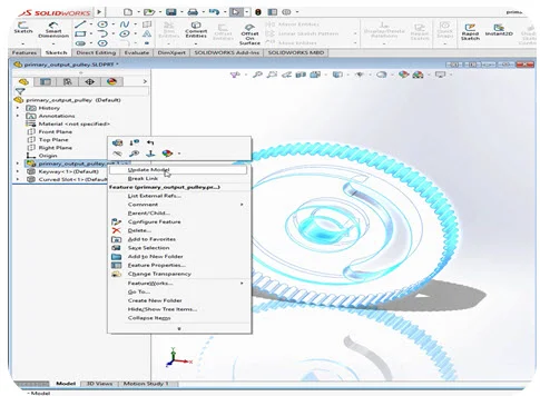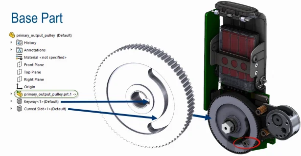 Let’s walk through a quick workflow to illustrate. The pulley in Figure 1 was designed in Creo. We can now open it in SOLIDWORKS 2017 just like a native file. It’s inserted as a virtual component in the feature tree. Its node icon showed a green arrow pointing to the left indicating it’s referencing an external CAD file. Furthermore, we can directly work on this model, rather than on any duplicate copies. For example, drag-and-drop SOLIDWORKS library features such as a keyway and a curved slot onto this model and constrain them to the edges on this Creo part.