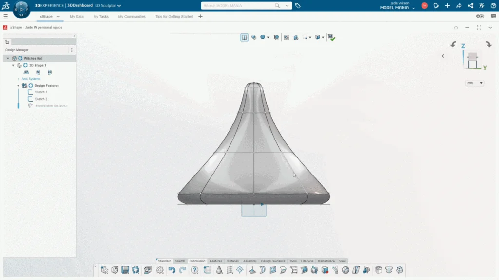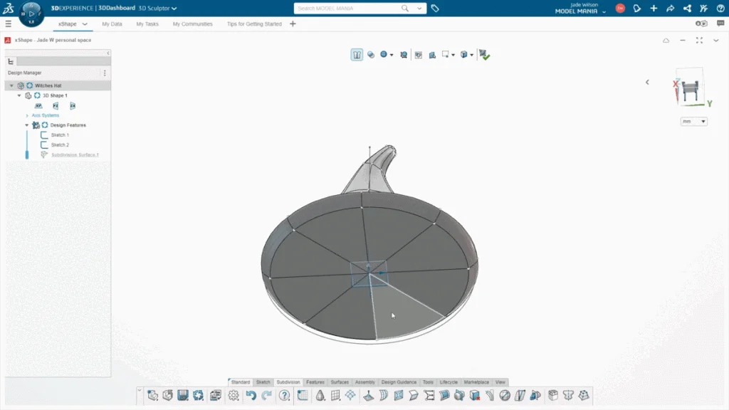 I decided to add a final little detail to my hat, it wasn’t necessary, but I split the bottom faces of the hat to add another loop, so that I could pull the bottom point up and into the hat. I turned on wireframe using view modes, so I could see how far I was from the outer walls of the hat, again ensuring I wasn’t leaving myself with weak 3D print walls. Once my hat is finished, I save again and export it to open within SOLIDWORKS.