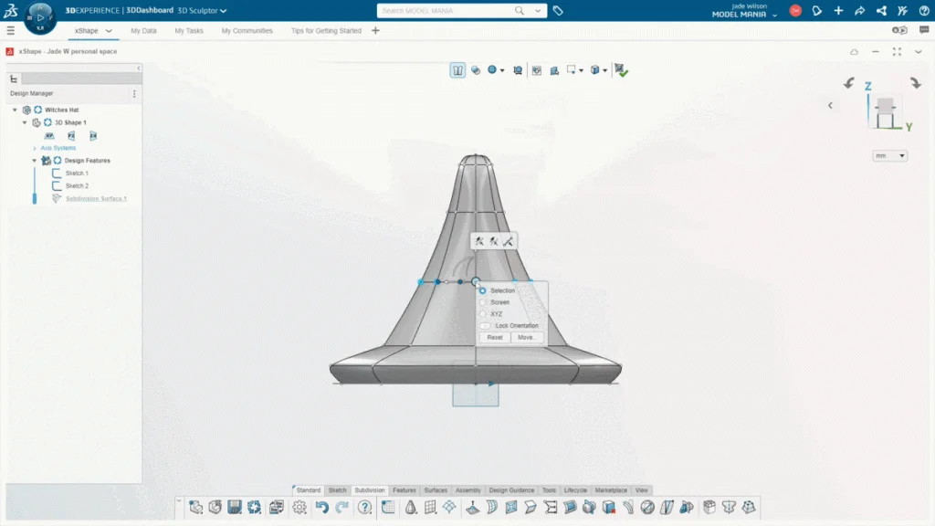 When I select the row of points across the hat, the robot wants to rotate based on the selection, I needed to change this to align with the XYZ axis. That way when I rotate points they go along my axis, this just makes my model easier and cleaner to work with. From here, it was just a case of rotating the other loops to bend the hat further all along and up to the tip of the hat. Again, I can be quite free in my modeling, sometimes its just trial and error seeing how your model will change as you push and pull points, but it is really fun to see your design take shape.