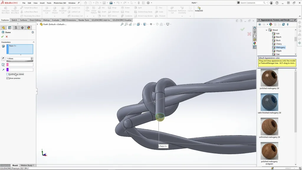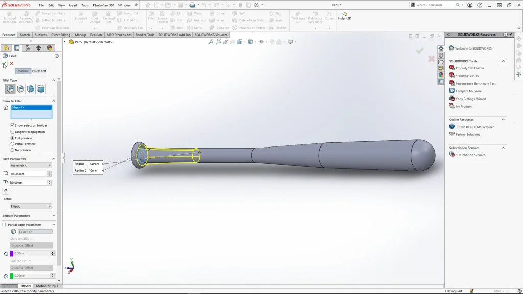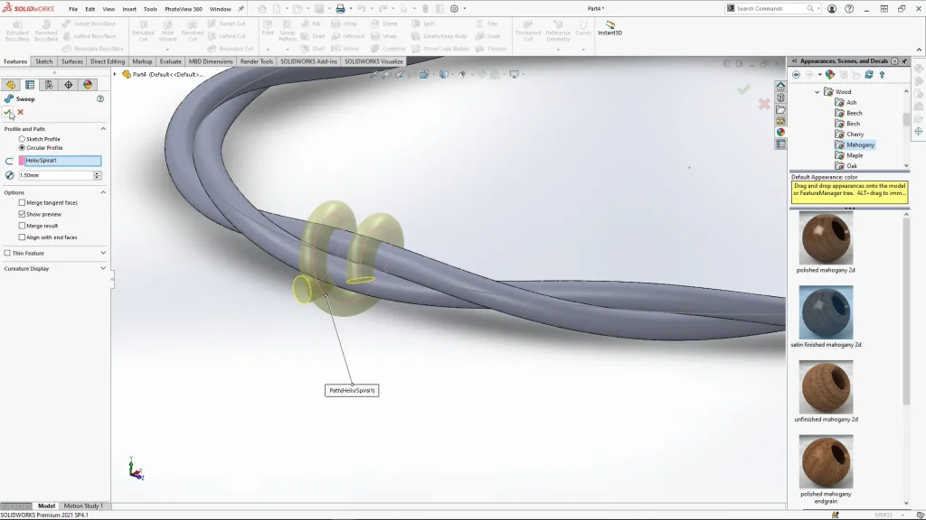 Welcome to this SOLIDWORKS tutorial for a zombie bat, to begin this assembly, I start by creating a baseball bats profile for revolving. One tip for this part, I advise adding any fillets after you have revolved the part, this makes it easier to adjust the original sketch, but also allowed me to add asymmetric fillets. Once the bat is modelled, I added a wooden appearance to it, firstly for my rendering of the part, but also this makes the part easier to see when mating wire parts to it in the assembly later on.