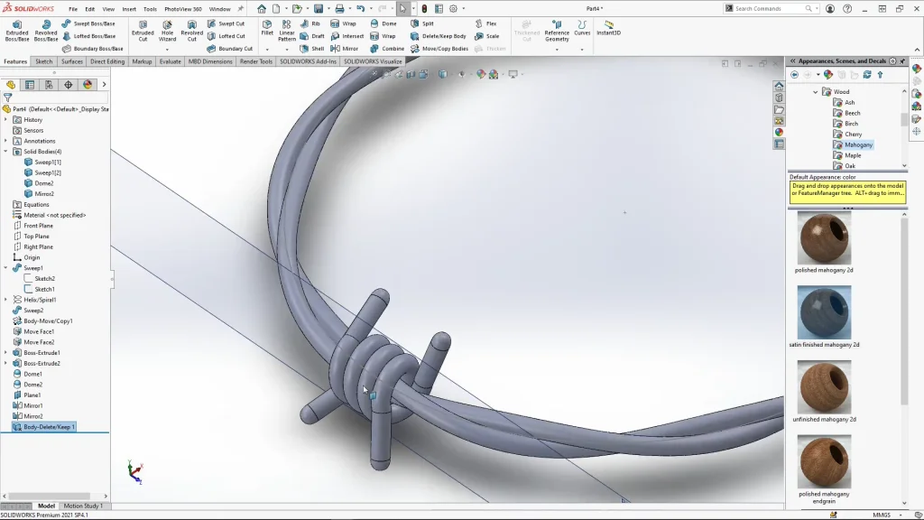 To create the recognizable barbed wire look, the wire needed to look more coiled and have more points coming away. To achieve this I used the mirror feature twice, I mirrored the barbed wire sweep along a new right plane center to the sweep axis, and then mirrored the mirrored body along the top plane. From here I could delete the first mirrored part to be left with an interlocking wire. The bodies were then circular patterned around the wire by 2 instances and a brushed metal appearance was added before saving the part and starting a new assembly.
