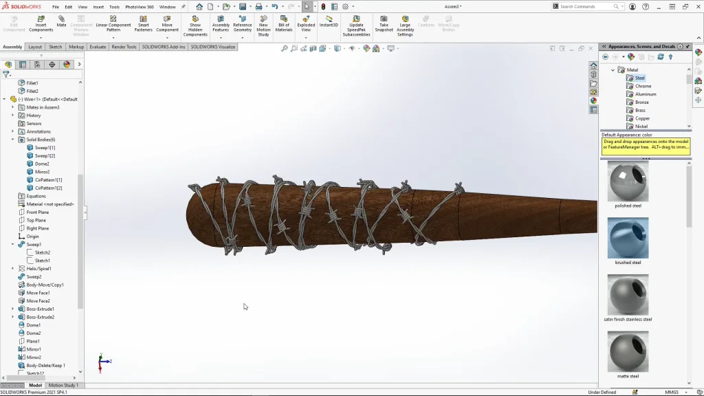 For the assembly, the bat part is a fixed component, then multiples of the wire part are dropped along the top end of the bat. They are mated into place using a coincident mate from the center of the wire to the centerline of the bat. The wires are spaced apart from the center point of each, this doesn’t fully define the wires, but it does give you an element of control for rotating them into place. For this part of the tutorial the placement of the wire doesn’t have to be perfect, the wire would embed itself or push against the bat in real life, so it’s just a case of playing around with the positioning of each wire until the cross over into each other. I wanted it to look like the wire loops were connected to each other and have been wrapped around the bat all the way down. One thing to note is you should try to alternate the barbed wire spikes so they aren’t too close together otherwise it wouldn’t look natural.